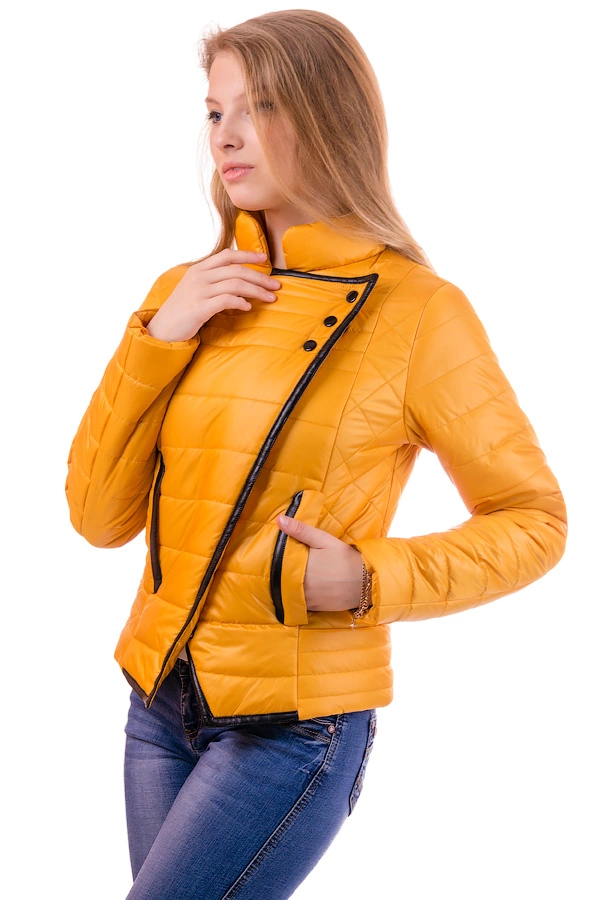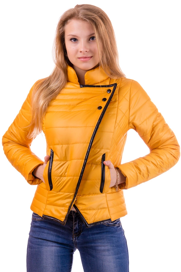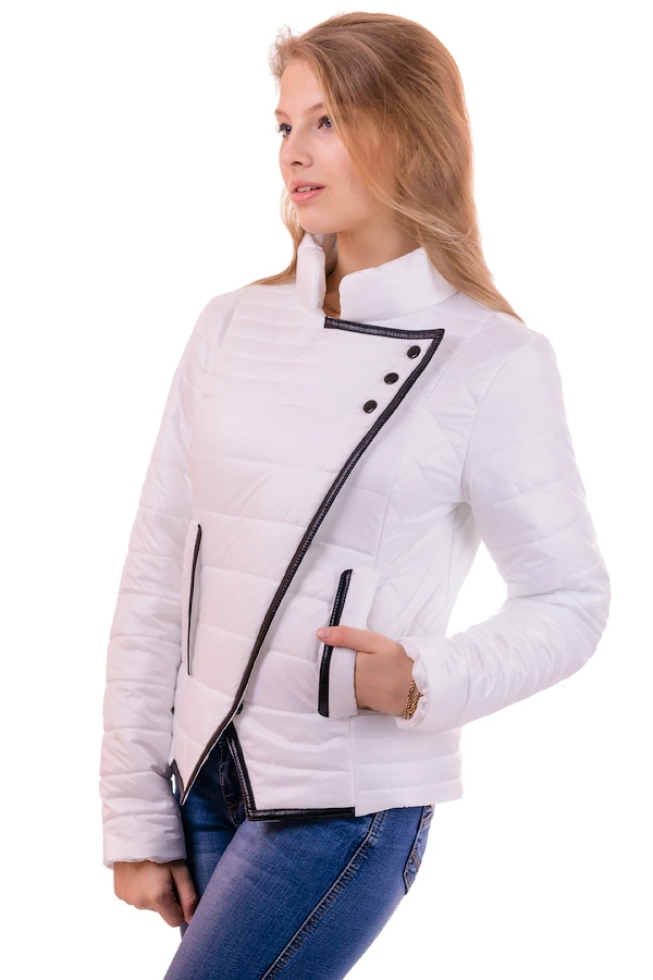 Укороченная весенняя куртка приталенного силуэта. Стильная модель сезона весна 2016. Изделие с ассиметричной планкой, отделанной кожей. Застегивается на молнию и кнопки. Длина изделия 55-57 см , длина рукава 62 см.