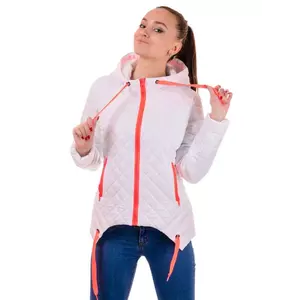 Яркая весенняя куртка с контрастной отделкой! Застегивается на молнию типа "трактор". По бокам два кармана, с декоративной змейкой в цвет отделки. Капюшон не съемный, затягивается на котрасный шнурок. Низ куртки также украшен шнурком, продетым в холитены. Ткань - плащевка лаке, утеплитель - синтепон(плотность 120). Длина изделия 62-64 см.