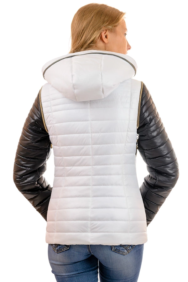 Куртка-трансформер.Ткань - плащевка, утеплитель - синтепон( плотность 120), подкладка - нейлон. Комбинированная двух-цветная куртка с отстегивающимися рукавами, что дает возможность ее носить и как куртку, и как жилетку. Карманы, плечи и капюшон украшены золотыми змейками. Капюшон - отстежной. Представлена в разных расцветках. Размерный ряд 44-50. Длина изделия 63-65см