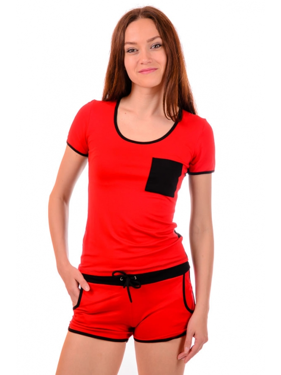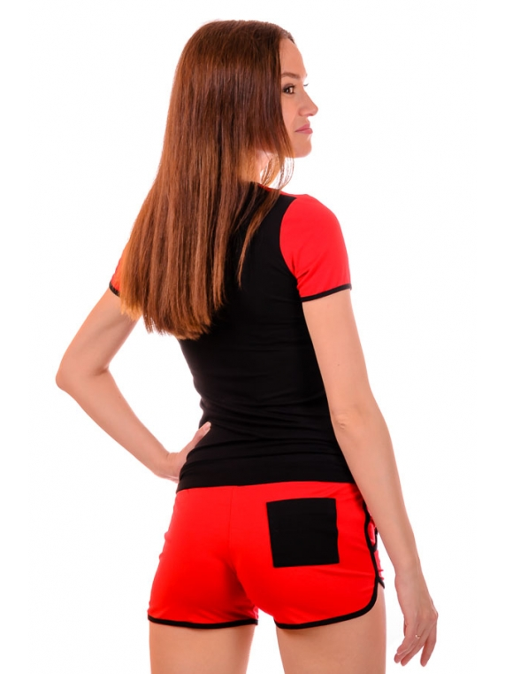 Отличный спортивный комплект шорты с футболкой. Подойдет как для занятий спортом, так и для повседневной прогулки, либо поездки на отдых. Очень интересно смотрится за счет сочетания контрастных цветов. На груди и сзади на шортах - пришивные карманы. Шорты затягиваются на шнурок. Ткань - вискоза. Длина футболки 56см, длина шорт 27см.