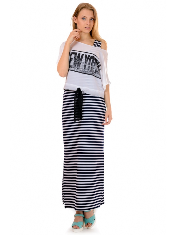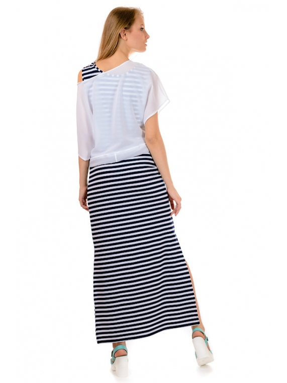 Молодежное женское платье в полоску. Изделие прямого кроя, сбоку декорированное разрезом. В комплект входит шифоновая футболка.Отличный вариант на каждый день.Ткань - вискоза.