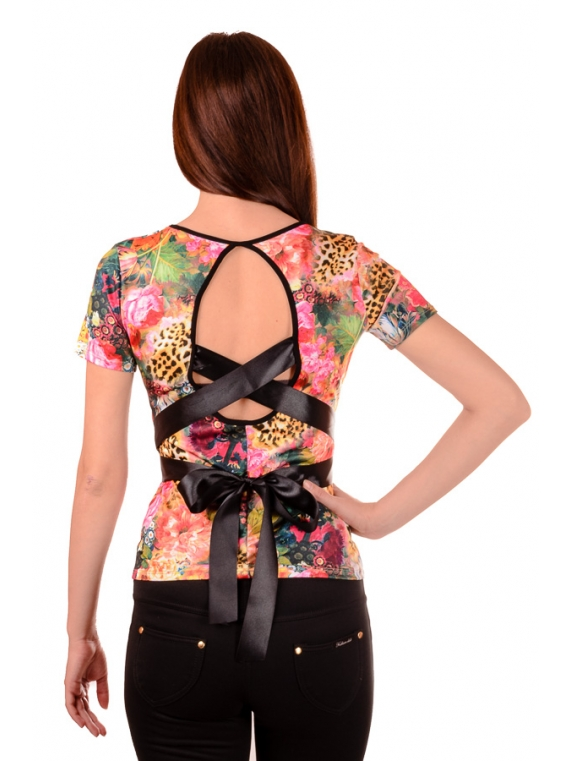 Летняя молодежная футболка с эффектным вырезом на спине. Особенно красивой ее делает атласная лента, которая обматывается вокруг. Ткань - микромасло. Длина изделия 57см.