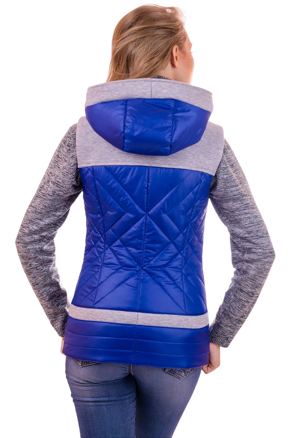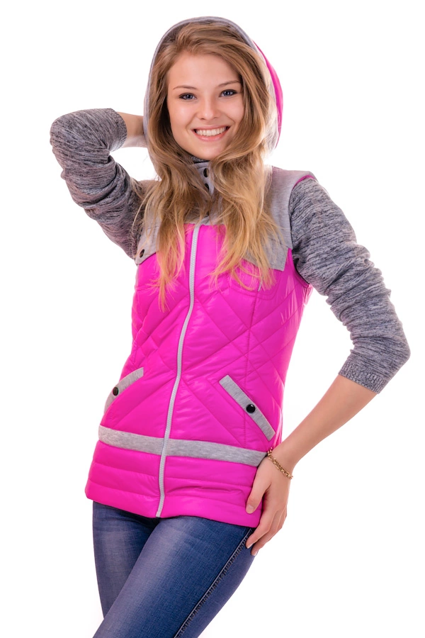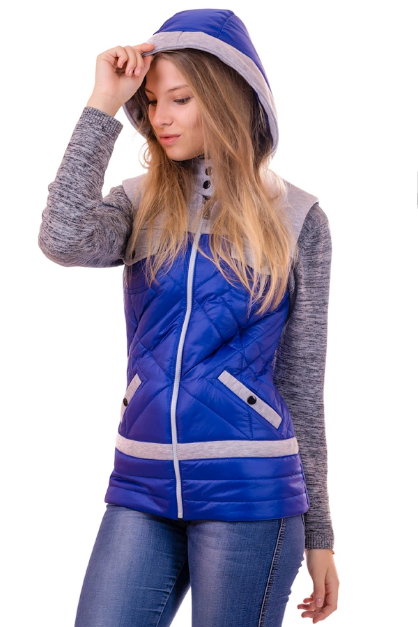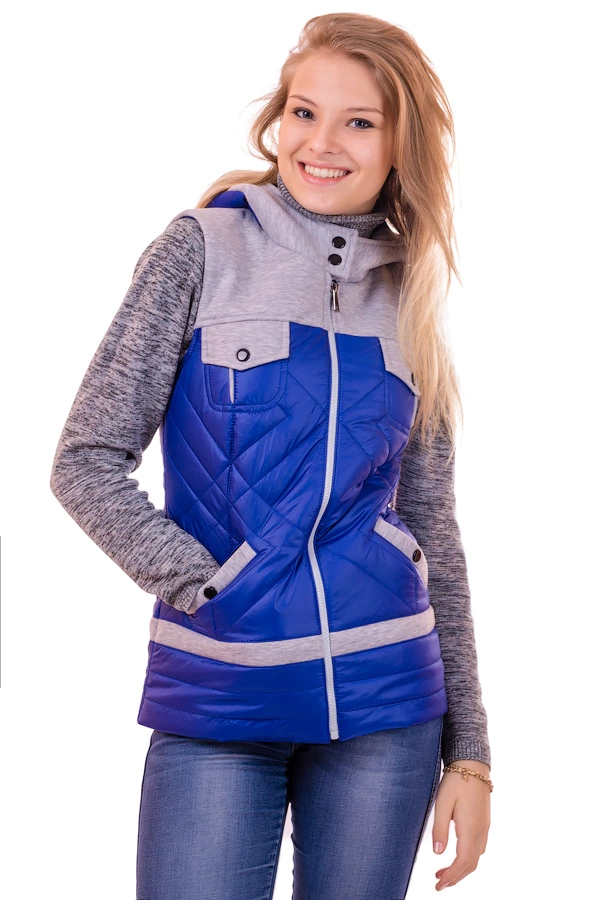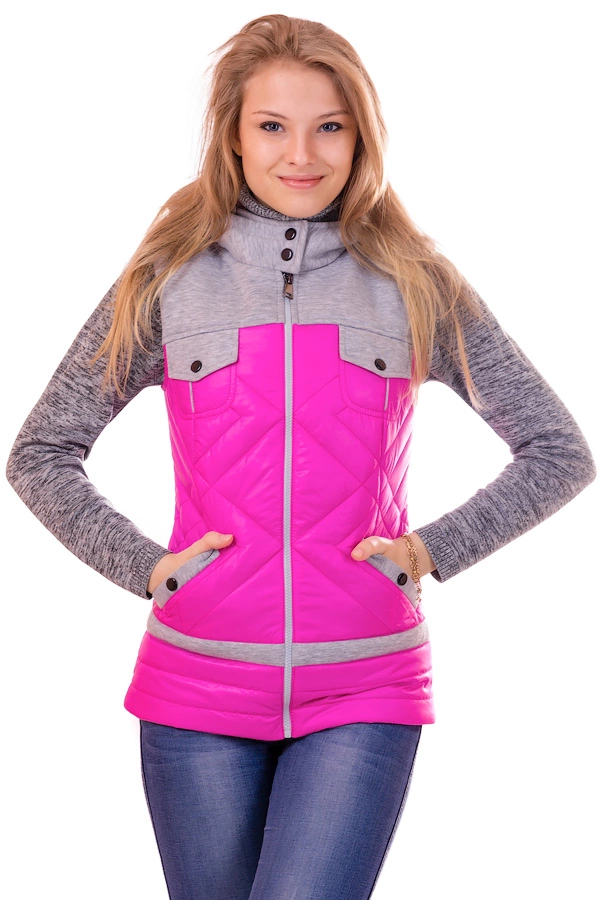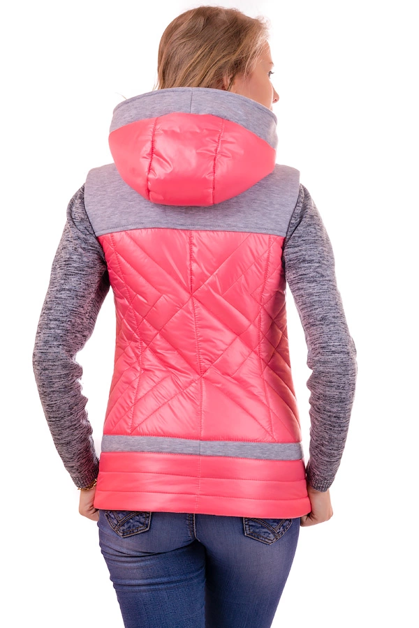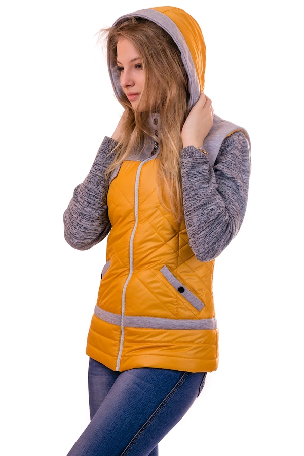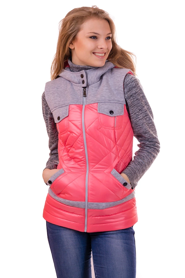 Яркая весенняя жилетка выполнена из двух тканей! Спереди изделие застегивается на молнию и дополненную планкой с кнопками, для дополнительной зашиты . По бокам два кармана на кнопке. Капюшон не съемный. Ткань - плащевка лаке, утеплитель - синтепон(плотность 120). Длина изделия 62-64 см.